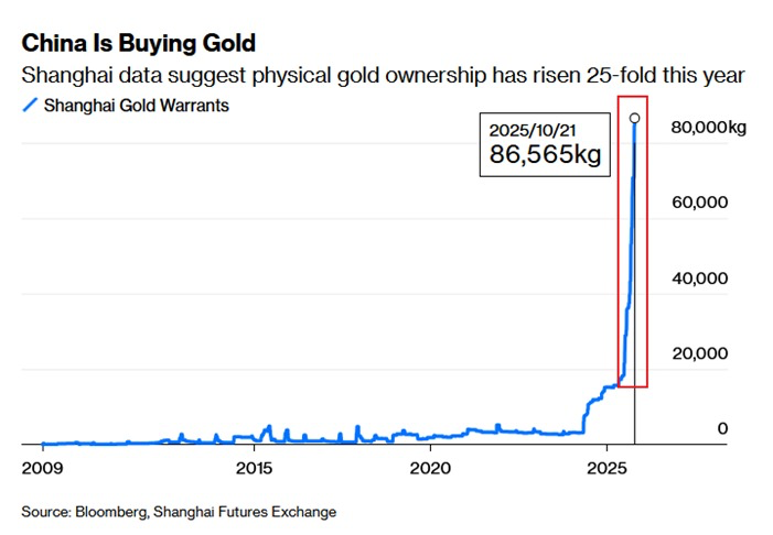 No surprise, then, that China has been buying a lot of gold through its central bank(s); this is evidenced by data from The Kobeissi Letter showing that Chinese Shanghai Futures Exchange (SFE) gold warrants have increased +570% YTD – nearly a thirty-fold increase over 2024.