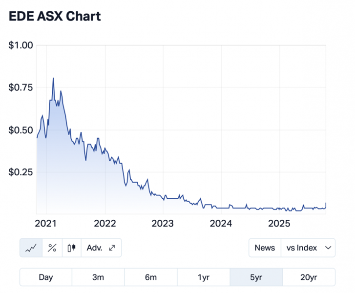 As of 1pm AEDT on Monday, around A$700K worth of shares had traded hands (with a 4wavg volume of 560K versus the ~10M shares trading hands in the nanocap on Monday). And for what it’s worth, Eden’s 5Y chart below.