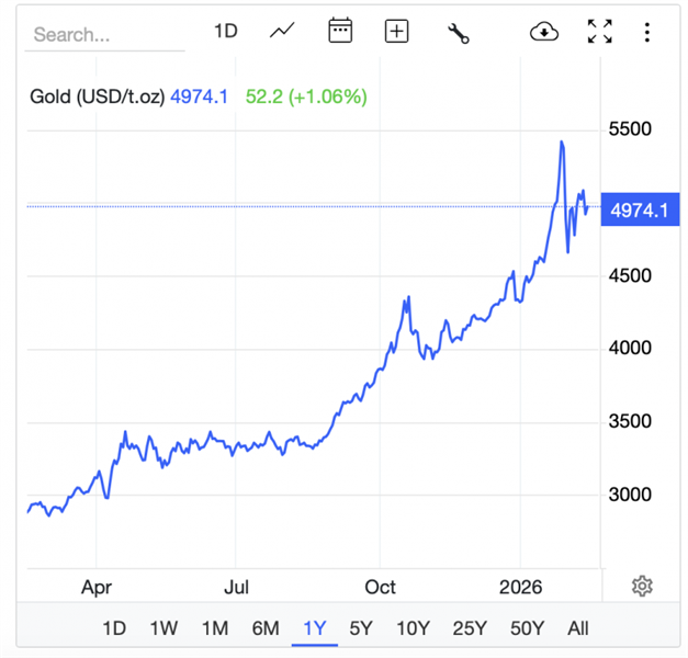 Still, maybe these jitters are compounded by the fact the gold price appears to have decided that US$5,000/oz is enough silliness for now.